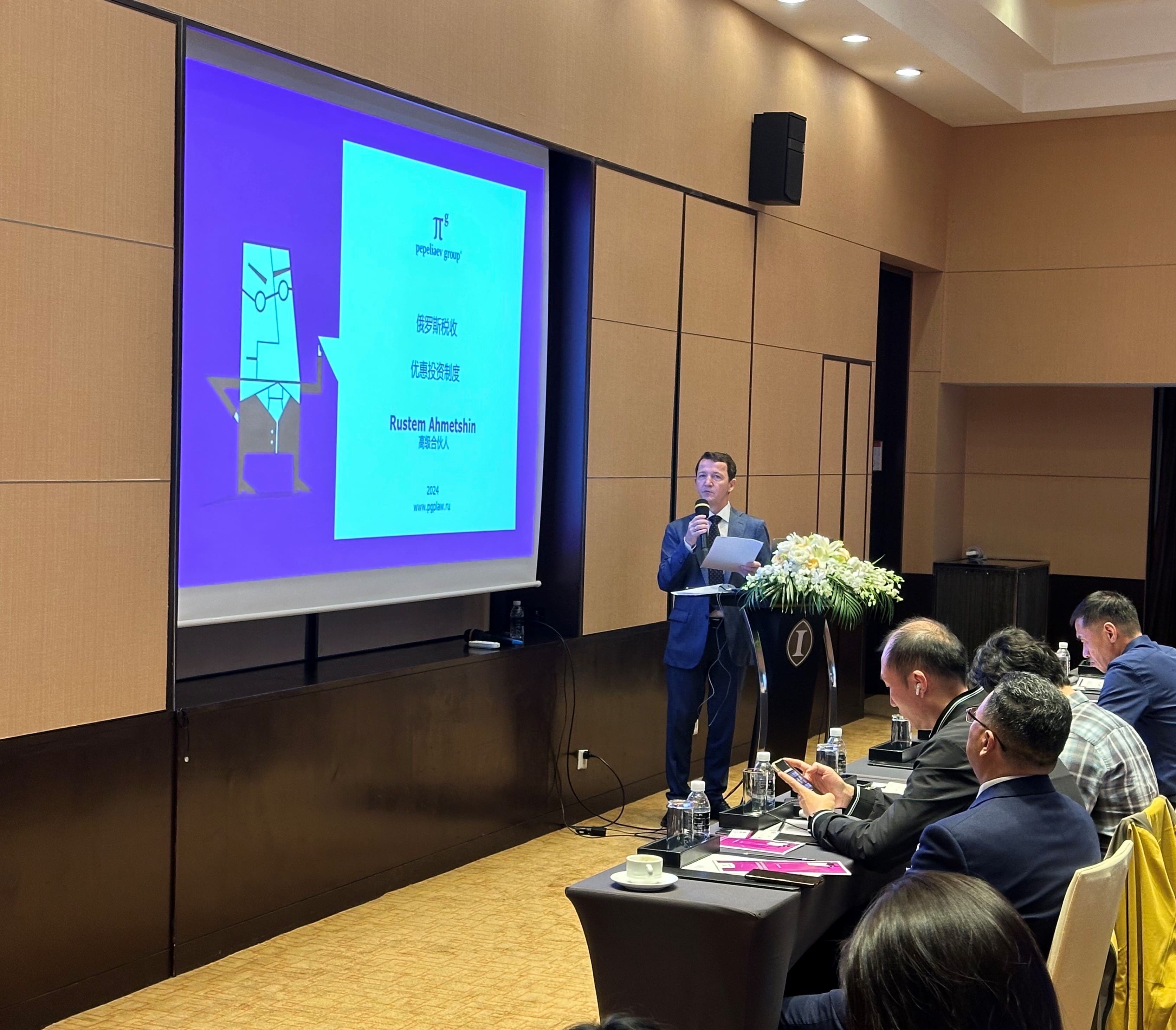 Наталья Стенина представила краткий обзор инвестиционного климата России, динамики российско-китайского инвестиционного сотрудничества, а также вопросов, с которыми наиболее часто сталкиваются китайские инвесторы. Рустем Ахметшин в ходе своего выступления по теме российской налоговой системы осветил ключевые аспекты налоговой реформы 2025 года, а также преференциальные инвестиционные режимы в России. Выступление Ильи Болотнова было посвящено устойчивому росту российской IT-индустрии и сопряженным правовым вопросам.